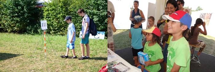 Viele Kinder nahmen auch mit Freude am Distanzmesswettbewerb teil. Um die ausgesteckte Distanz in Fuss abzuschätzen, durften sie in Römersandalen schlüpfen. Zu gewinnen gab es tolle Preise - u.a. zwei Laserdistanzmessgeräte (Leica DISTO D110).